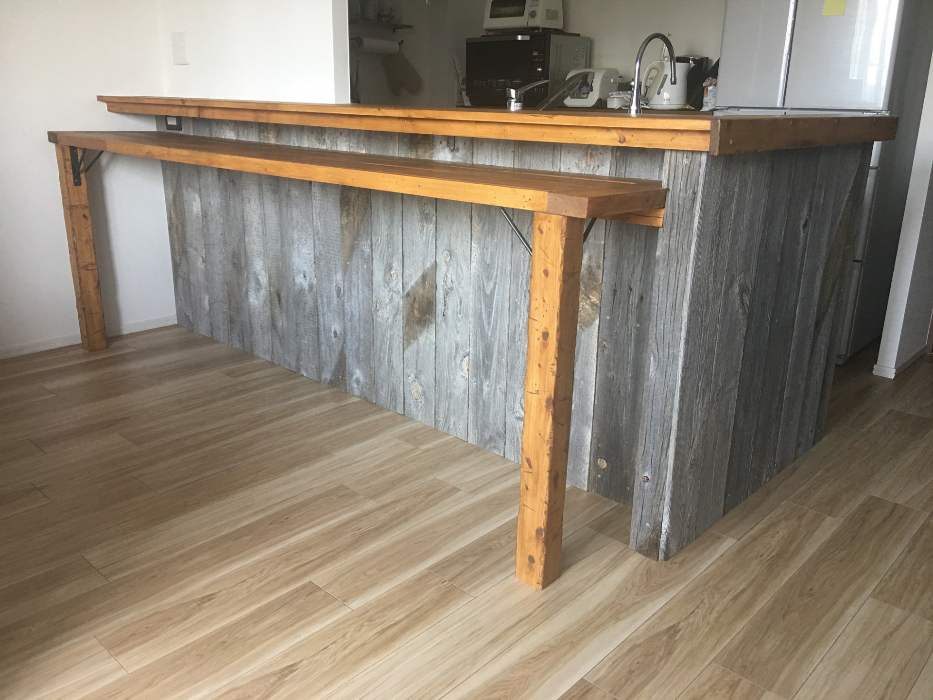 新築マンションのキッチンをDIYで変身させたN様。キッチンカウンターの腰材にドレスボードを貼り、カウンター部分はフェイクビンテージウッド(ラスティックパイン)で抜群の相性です。