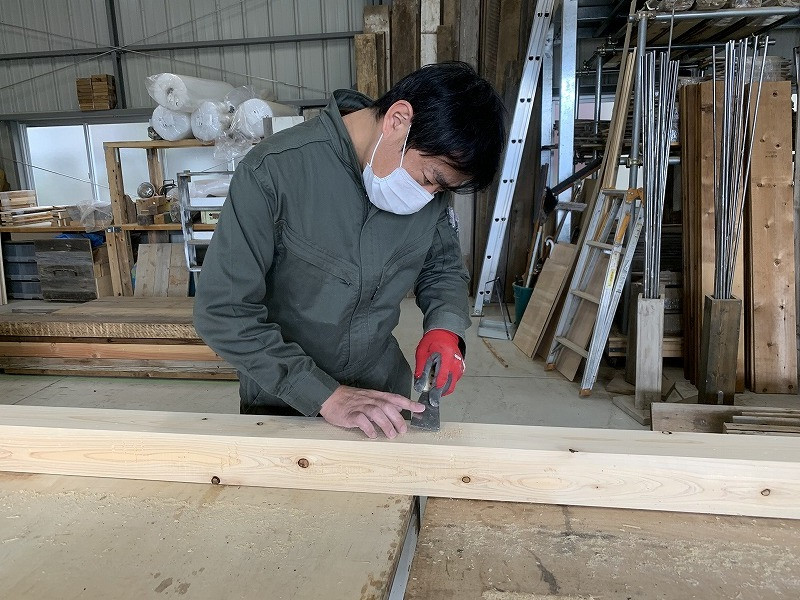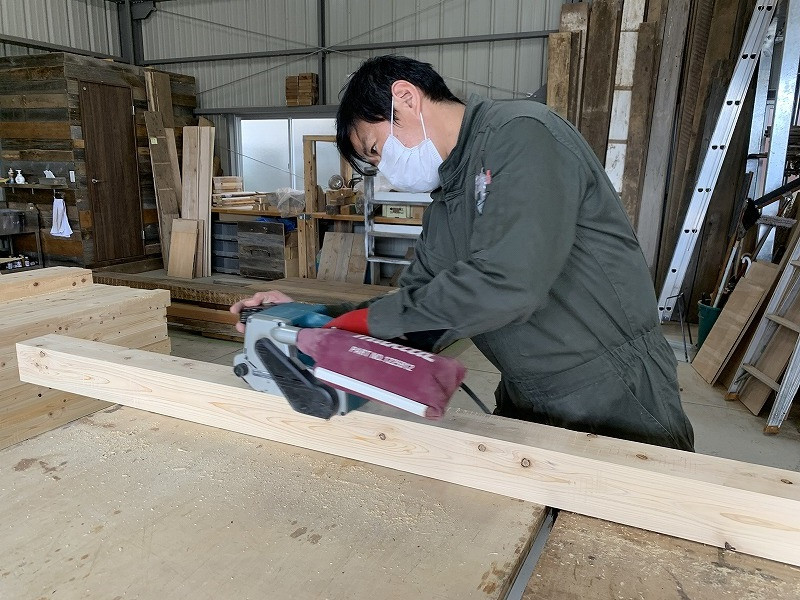 ヒノキ無垢材を古材風に加工していきます。エイジング加工はレギュラー