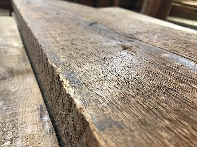 長年に渡って建物を支えながら風化した古材で、何よりも約100mmの厚みは迫力満点!