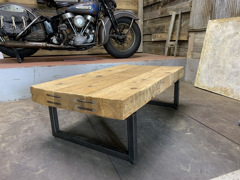 無骨な天板とスタイリッシュな黒皮鉄の脚の組み合わせて、