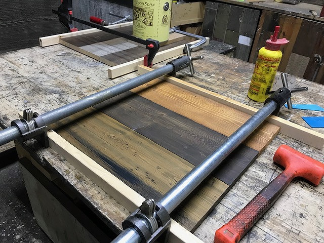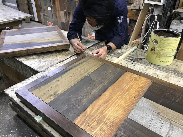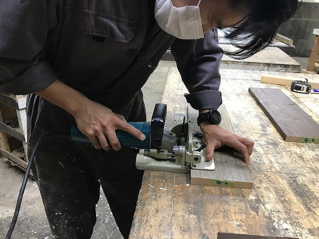 定番のスタイルは同色の部材を並べて接合し、天板に仕上げるのですが、今回は異なるカラーのものを貼り合わせて