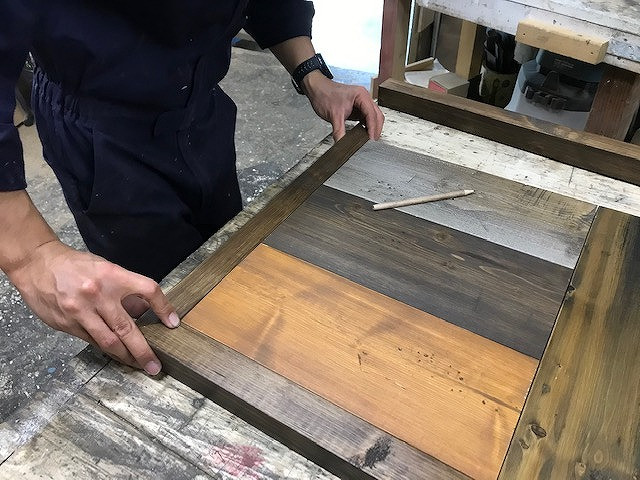 強度を高める為に背板を当て、更にこの板の四方をツーバイ材で巻きます。四方を巻くことによって、使用時に何度も