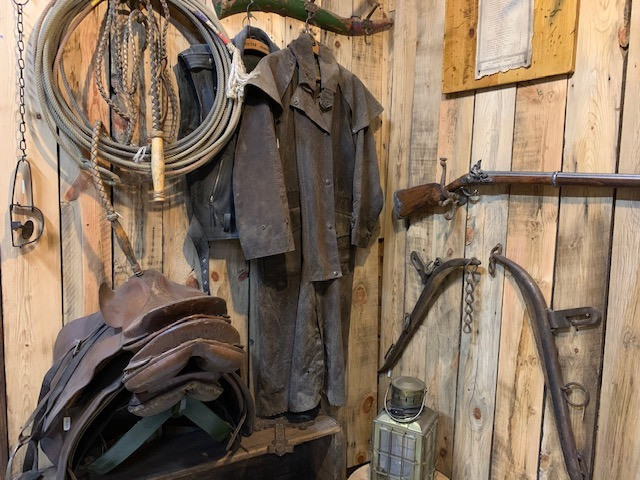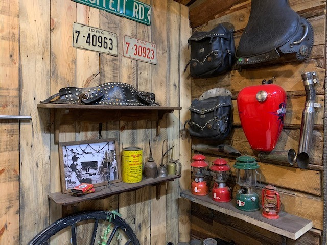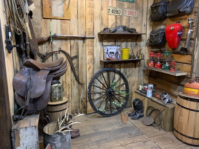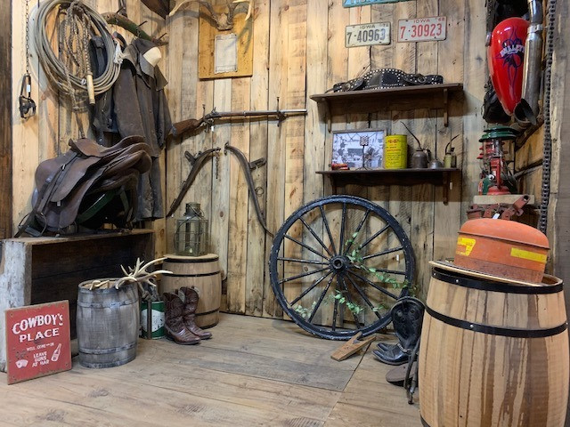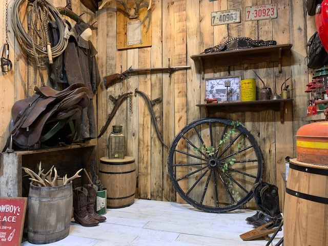 アーリーアメリカンのガレージ風なデザインにしており、左側は西部開拓時代を感じさせる乗馬道具、右側には現代のオートバイ道具をディスプレイしています。