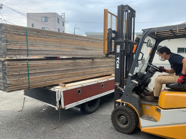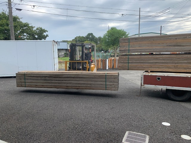4000mmの長さで入荷するアシバボードは、フォークリフトを使って慎重に運びます。