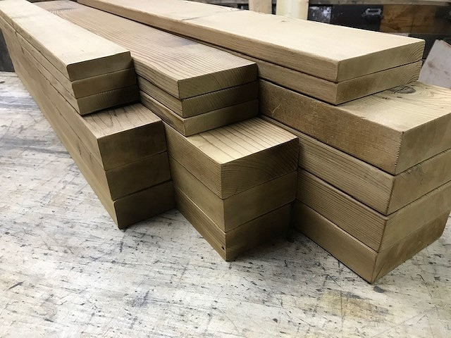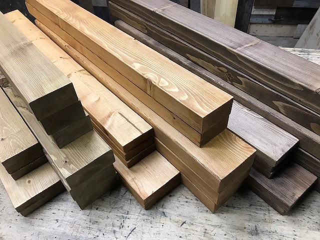 幅も厚みもバラバラの部材ですが長さを揃える事で、並べた際にしっかりと纏まりのある仕上がりになります。