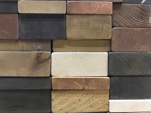カラーアソートの木材で壁面装飾【大阪で古材リフォーム】
