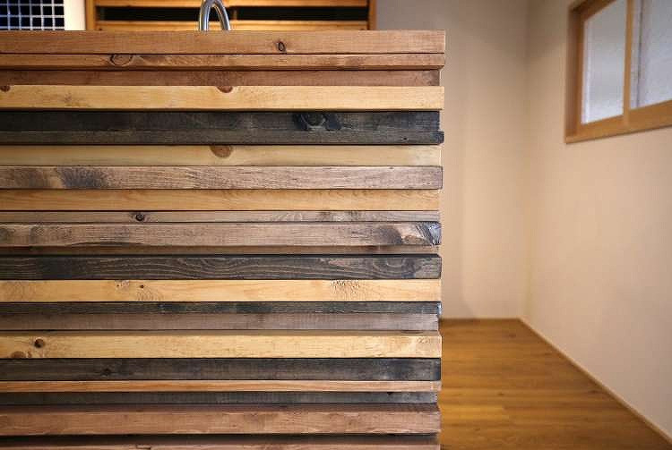 古材独特の風合いのある演出も可能です。また、通常は脇役に回ってしまう事が多い木材の木口面を敢えて