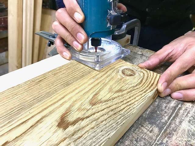トリマーで溝切り加工をしていきます。トリマーはビットや高さ調整で様々な形の溝切りや飾り面取りができるので、シンプ