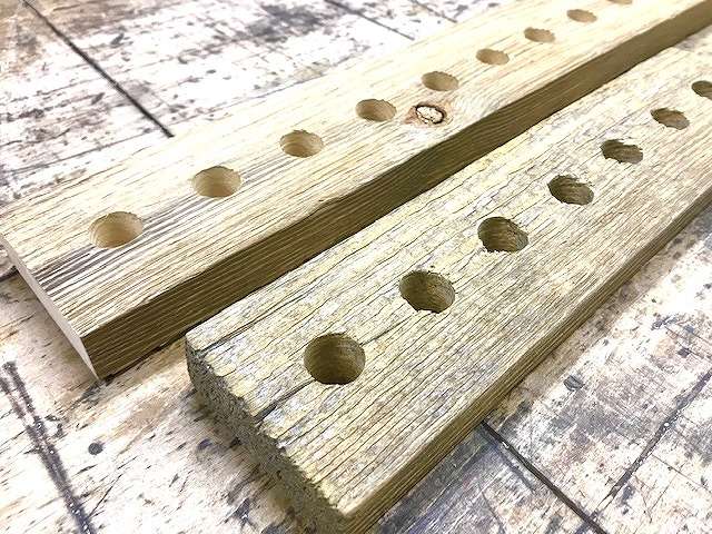 今回のご依頼ではドライバーのようなスティック状の展示品を並べる為、それらを等間隔で固定するための穴を木工ドリルで開けていきました。
