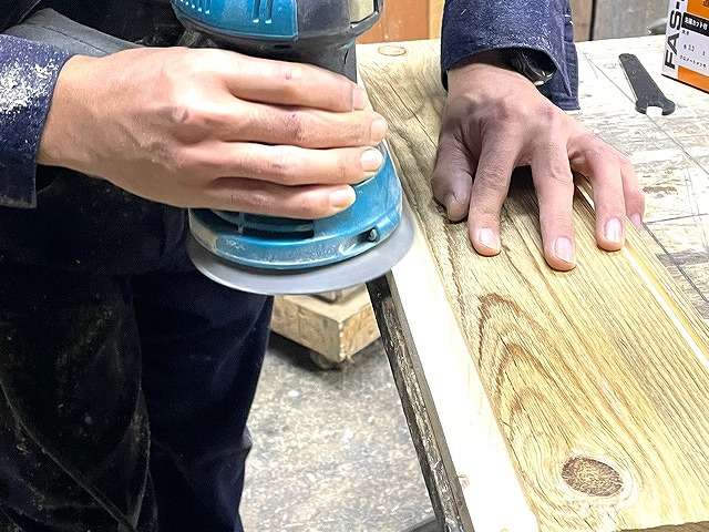 まずは日光に曝されてグレーに風化したフェンスウッドを、サンディングでグレーカラーを飛ばしてブラウン系の色味に。
